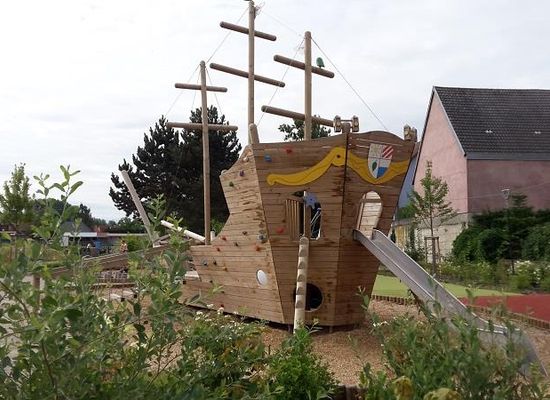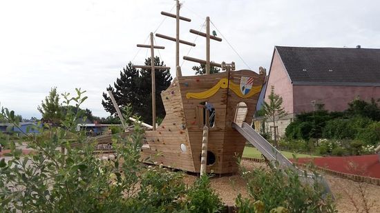 The playground in Neuwies follows the course of the Rhine before it was built: the paths, like the meanders and wanderings of the Rhine, create islands that are home to play activities here, reminiscent of the special features of Mothern
