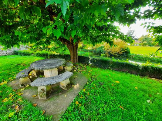 Picnic table pleasantly located at the edge of the brook, in the shade.