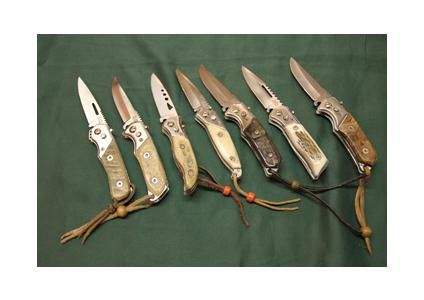 Handcrafted pocket knives made from natural materials, horns, wood, fossils and 128 to 145-ply Damascus blades.