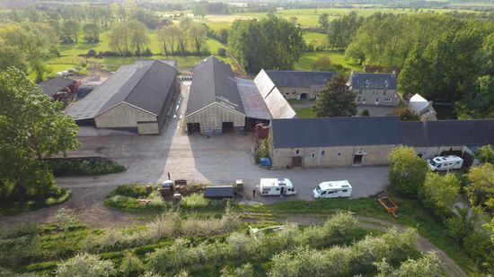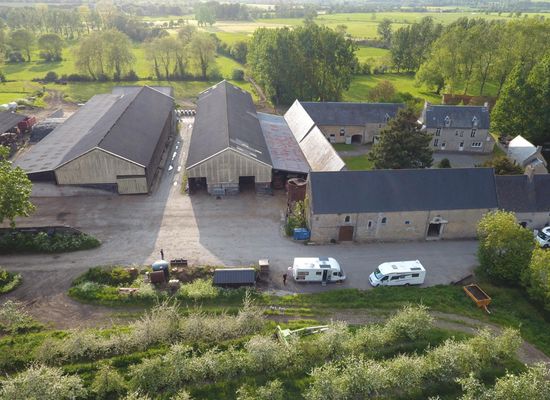Parking area for camping cars. France Passion stage. 16th century Bessin farm in white stone. Tarred pitches or under the apple trees in the summer.