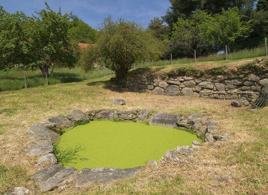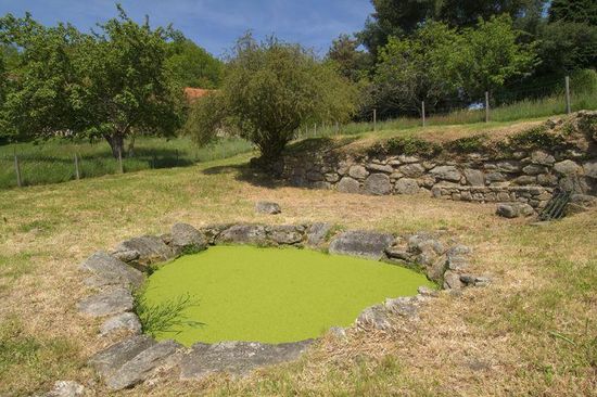 The group of buildings is at the centre of an orchard. The fountain, built behind a supporting wall, feeds a circular washhouse.