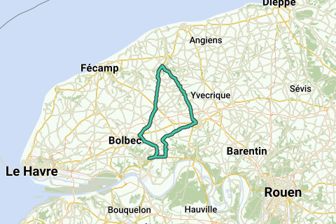 La Frenaye, D982 to the left Anquetierville, D440 descent towards the Fond des Mares then ascent to the left D40 towards the castle of St Aubin de Creteau, to the right D34 Allouville-Bellefosse, Yvetot, D131 Autretot, Héricourt, Grainville la Teinturière, to the left D50 Ourville en Caux, Fauville, D109 Auzouville-Auberbosc, Lanquetot, Lintot, Grandcamp, Auberville, La Frenaye. (possibility to cut from Héricourt to Fauville)