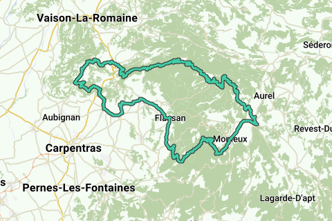 Beautiful, fairly challenging bike ride from Malaucène with one climb of the Ventoux, focusing mainly on the region south of Malaucène. The route starts in Malaucène with the famous climb of Mont Ventoux via the D974, after which it descends towards Sault via the D164. From Sault, you go via Monieux to the top of the Gorges de la Nesque, where you have a beautiful view of the top of Ventoux. Descent to Villes sur Auzon with a breathtaking view of the valley. Then it heads towards Bédoin, via Flassan. Passing through Crillon le Brave, Modène, and Caromb, it continues to the beautiful 'Le Barroux,' where I chose a short but very steep climb via the 'Route Ancienne de Caromb.' From here, the route is characterized mainly by short, steep inclines, followed by similar descents. The long descent from La Roque Alric to Lafare and the long climb from Lafare to Suzette (where you have a nice view of the Dentelles de Montmirail) are exceptions. Ultimately, my Garmin recorded 2,640 meters of elevation.