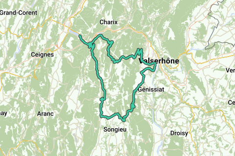You will then face a long descent for your wheels, plunging into the valley of the Rhône River, and then climb out of the valley again to the top of Col de Cuvéry (about 12 km of climbing). During the climb, near the hamlet of Le Catray, there is a beautiful viewpoint of the surroundings. At the top, there's no immediate descent; you are on the Plateau de Retord, which is covered with meadows, hedges, and small woods. At the end of May and beginning of June, daffodils bloom in abundance here.
