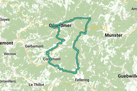 Gerardmer, Col de la Grosse Pierre (953m), La Bresse, Croix des Moinats (viewpoint), Cornimont, Ventron, Col d'Oderen (879m), Kruth, Col du Bramont (956m), Vallée de Vologne, Col de la Schlucht (Le Collet) (1000m), Le Valtin, Col du Surceneux (810m), Gerardmer. (92km)