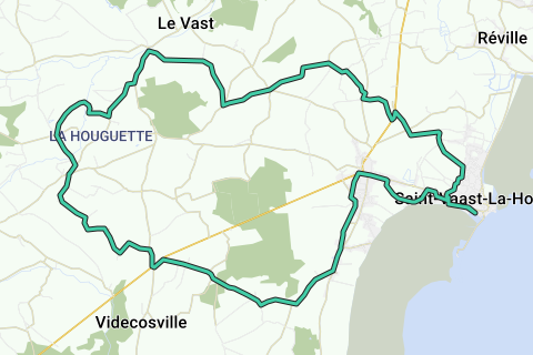 This bike route departs from the campsite of Saint-Vaast-la-Hougue. The trip goes along small, low-traffic asphalt roads through the Norman landscape. A few short sections along a busier road and a few short unpaved sections, but definitely well-ridable.