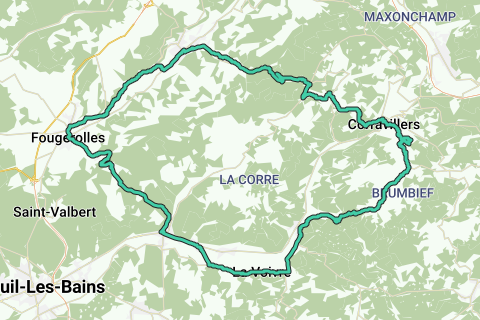 Departure from Le Bonnefroy via Esmouliers, Faucogney to Fougerolles and back via Val d'Ajol to Corravillers, a ride of about 56 km.
