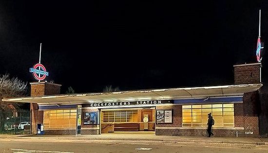 Cockfosters is a London Underground station on the Piccadilly line, for which it is the northern terminus. The station is located on Cockfosters Road approximately nine miles from central London and serves Cockfosters in the London Borough of Barnet, although it is actually located a short distance across the borough boundary in the neighbouring London Borough of Enfield. The station is in Travelcard Zone 5 and the next station south-east is Oakwood.