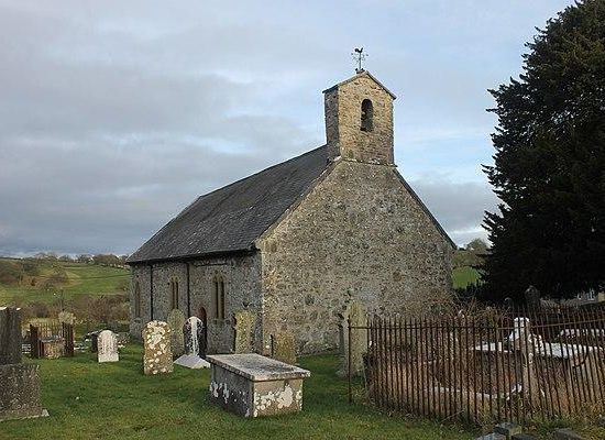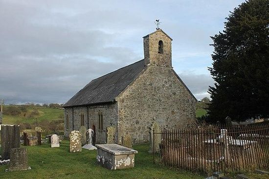 This neat and well-kept church stands on a hill – ‘Clocaenog’ means ‘mossy knoll’ – above the village. Dedicated to St Foddhyd , ancient records show that its patron was ‘St Meddvyth the Virgin’, daughter of St. Idloes of Llanidloes in Powys. The restored interior is dominated by a fine ‘rood screen’ , its top rail intricately carved with trailing foliage and its lower panels with ‘candle-flame’ motifs. These date to about 1538, the date once inscribed in the big east window above the altar. The window now displays fragments of its original stained glass, including heads of men and angels and the nail-pierced feet of a crucified Christ. The roof is also late medieval, as may be the massive dug-out chest hewn from a single tree trunk. Later treasures include the pulpit of 1695 and an elaborate wooden chandelier with beast-head decoration, dated 1725.