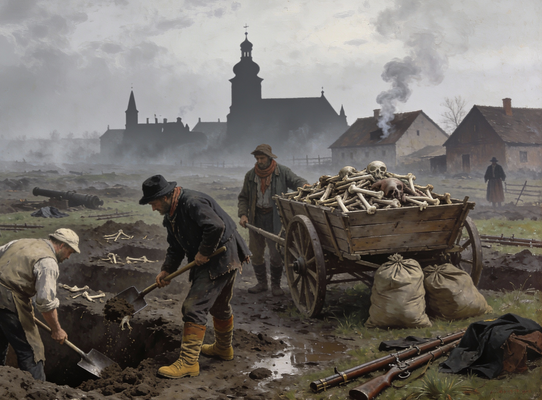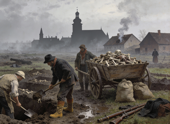 Historians and conflict archaeologists point out that European battlefields with thousands of shallowly buried bodies (soldiers and horses) provided a cheap, concentrated source of bones, with the British Isles being an important market.