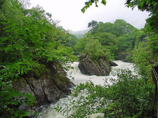 The Falls of Leny are a series of waterfalls in the Trossachs of Scotland on the course of the Garbh Uisge, otherwise known as the River Leny, where the river crosses the Highland Boundary Fault. The falls are located near the Pass of Leny, just north-west of Callander.