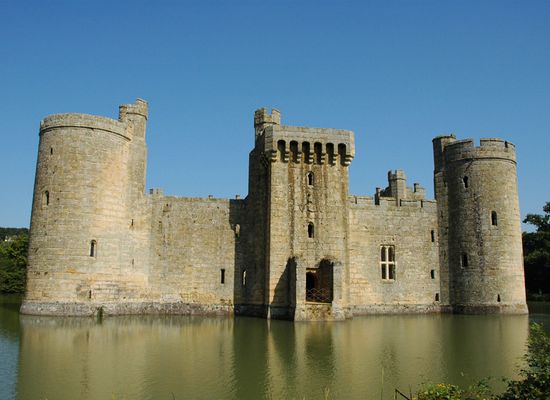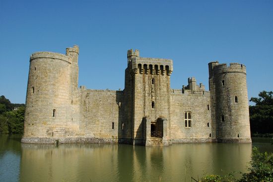 As you cross over the railway line you will be able to see Bodiam castle in front of you. The appearance of Bodiam Castle is exactly how most people imagine a medieval castle should look like, with its square of walls, a round tower at each corner, and a square tower midway along each wall, entirely surrounded by a moat. That it looks so perfect and picturesque may not be by accident for many people have debated whether the castle was really built as a defensive fortress or as an elaborate stately home.