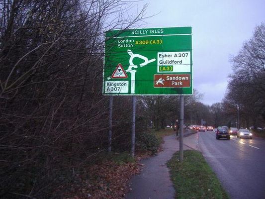 The Scilly Isles () is a double roundabout between the English towns of Esher and Kingston upon Thames on the traditional route of the Portsmouth Road. The name is a corruption of "silly islands", a nickname given to the road system when it was built in the 1930s.