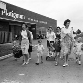 Platignum Pens moved to Stevenage in 1957. The move to the new town meant more space and allowed the company to diversify into plastic stationery accessories and fibre tipped pens as well as the production of fountain pens and pencils. The company moved production to Royston in 1984 and closed the Stevenage factory. Our picture shows: Young mums with their children arrive at Platignum Pens on Six Hills Ways 16th August 1961. The company was one of the first to open a day nursery for its workers in the town.