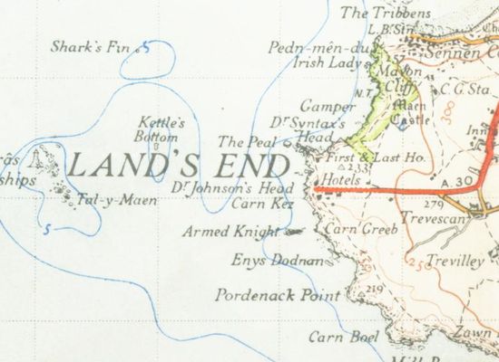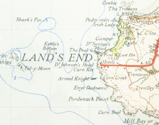 Land's End has a particular resonance because it is often used to suggest distance. Land's End to John o' Groats in Scotland is a distance of 838 miles (1,349 km) by road and this Land's End to John o' Groats distance is often used to define races, walks or charitable events in the UK.