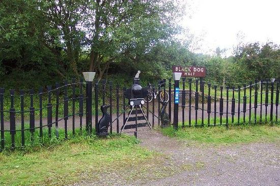 Black Dog Halt is a former railway station on the Chippenham and Calne line in Wiltshire, England. Originally created in 1863 as a private stop for Lord Lansdowne of Bowood House, it became a public request stop after the formation of British Rail. The halt was closed and demolished in 1965, and today it is part of National Cycle Route 403.