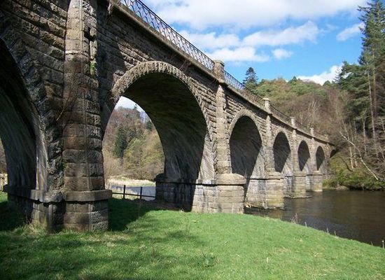 Neidpath Viaduct, occasionally known as the Queen's Bridge, consists of eight stone skew arches and was built to carry the Symington to Peebles branch line of the Caledonian Railway over the River Tweed to the south-west of Neidpath Castle. Now closed to rail traffic the bridge is used as a footpath.