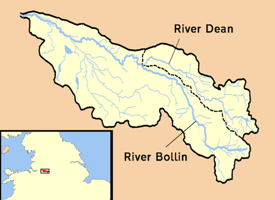 It rises in Macclesfield Forest at the western end of the Peak District, and can be seen in spring form, from the Buxton to Macclesfield road. The stream then descends the 10 miles through Macclesfield and The Carrs Park in Wilmslow where it has a confluence with the River Dean, near to Styal Prison. For the following 10 miles it defines the southwestern portion of the border between Greater Manchester and Cheshire before merging with the River Mersey north of Lymm. It flows through the Styal country park and was used in the cotton calico factory there, Quarry Bank Mill, as a source of power. Near to the Quarry Bank Mill site there is a natural weir. The Bollin is culverted underneath the southern runway of Manchester Airport.