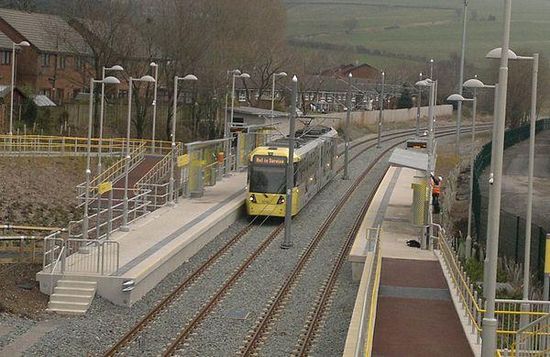 Newhey is a tram stop on the Oldham and Rochdale Line of Greater Manchester's light-rail Metrolink system. It opened to passengers on 28 February 2013 and is located in Newhey, a suburban village the Metropolitan Borough of Rochdale, England.