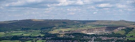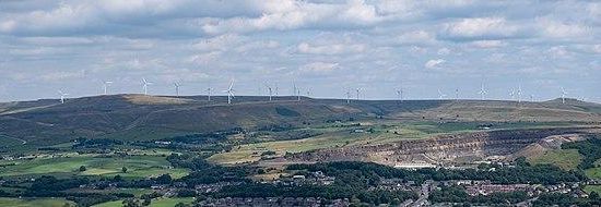 Scout Moor Wind Farm is the second largest onshore wind farm in England. The wind farm, which was built for Peel Wind Power Ltd, produces electricity from 26 Nordex N80 wind turbines. It has a total nameplate capacity of 65 MW of electricity, providing 154,000 MW·h per year; enough to serve the average needs of 40,000 homes. The site occupies 1,347 acres of open moorland between Edenfield, Rawtenstall and Rochdale, and is split between the Metropolitan Borough of Rochdale in northern Greater Manchester and the Borough of Rossendale in south-eastern Lancashire. The turbines are visible from as far away as south Manchester, 15–20 miles away.