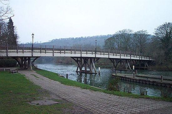 The present bridge was built in 1923, and is in two parts: The western bridge is from Streatley to an island in the river ; The eastern bridge is from the island to Goring and overlooks Goring Lock. The bridge consists of timber struts supporting a metal roadway.
