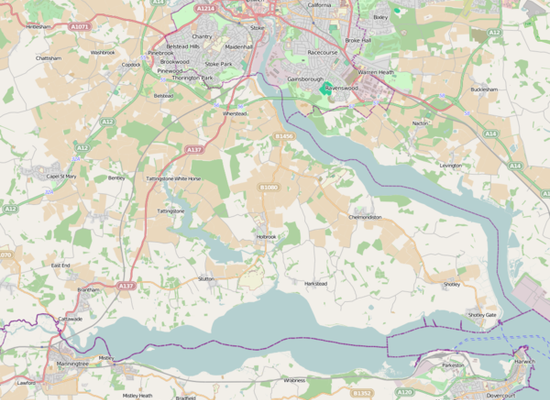 The Shotley Peninsula is a rural area east of the A137 Ipswich-Colchester road located between the rivers Stour and Orwell in Suffolk, England. The peninsula is named after the settlements of Shotley and Shotley Gate which are situated near its south-eastern tip. Other villages on the peninsula include Chelmondiston, Erwarton , Freston, Harkstead, Holbrook, Stutton, Tattingstone, Wherstead and Woolverstone.