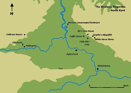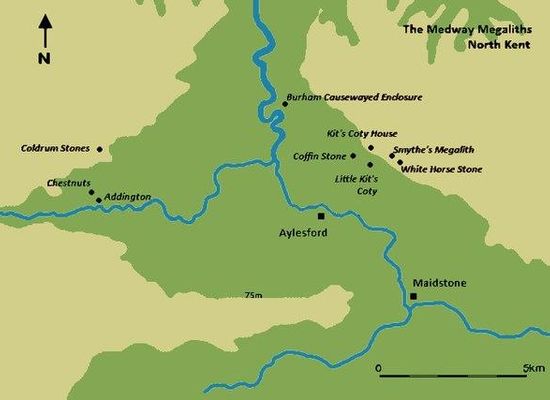 The Medway Megaliths, sometimes termed the Kentish Megaliths, are a group of Early Neolithic chambered long barrows and other megalithic monuments located in the lower valley of the River Medway in Kent, South-East England. Constructed from local sarsen stone and soil between the 4th and 3rd millennia BCE, they represent the only known prehistoric megalithic group in eastern England and the most south-easterly group in Britain.