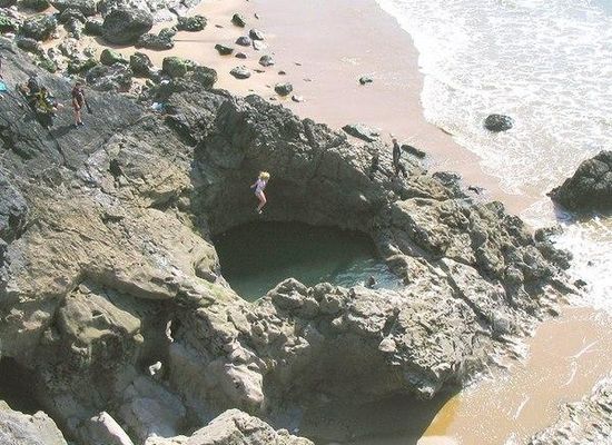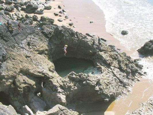 Blue Pool Bay is a small cove near the village of Llangennith in Gower, Wales. The cove is bordered by cliffs, and is accessible via a clifftop path and a steep, unstable path down to the beach. The beach is covered fully at high tide and takes its name from a large, natural rockpool. Rhossili Bay is nearby.