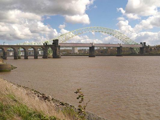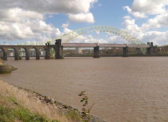 The Runcorn Railway Bridge, Ethelfleda Bridge or Britannia Bridge crosses the River Mersey at Runcorn Gap between Runcorn and Widnes in Cheshire, England. It is alongside the Silver Jubilee Bridge. The bridge is recorded in the National Heritage List for England as a Grade II* Listed building.