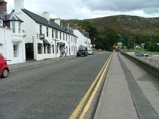 The A835 road arrives in Ullapool from the south-east, bearing the name Garve Road, and at the edge of the town, it turns right, to continue northwards. At this junction, where the A835 loses its trunk-road status, the A893 continues straight on, to the ferry terminal at the far end of Shore Street.