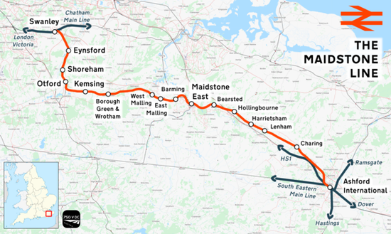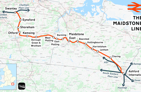 The Maidstone line is a railway line in Kent, England. It diverges from the Chatham main line at Swanley Junction and proceeds down the Darenth valley to Otford junction . It continues via Borough Green & Wrotham and Maidstone East to Ashford, where it joins the South Eastern Main Line.