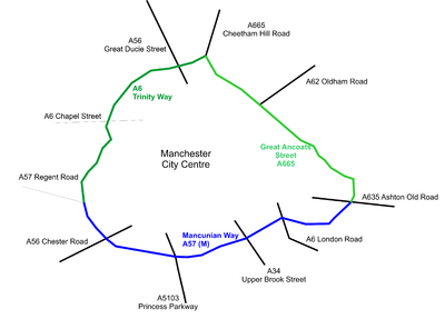 Manchester and Salford Inner Relief Route is a ring road in Greater Manchester, England. It is the product of the amalgamation of several major roads around Manchester and Salford city centres to form a circular route. It was completed in 2004 with the opening of a final section to Trinity Way.