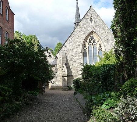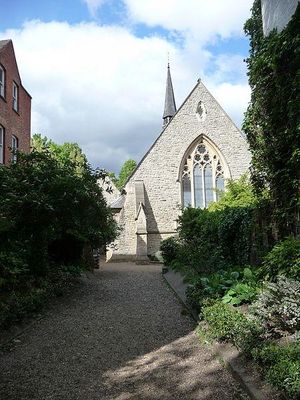 The chapel, which stands on Rosslyn Hill, was at first a simple wooden structure. Said to have been built in 1692 by Isaac Honeywood who lived in the adjoining mansion, the Red Lion Hill meeting house was first replaced in 1736 and then, having become unsafe, rebuilt in brick on roughly the same site in 1828. The current building was built from 1862 to 1885 in the Neo Gothic style. Two of the building's stained-glass windows are by Edward Burne-Jones and William Morris and another is by Henry Holiday. It holds four John Flaxman reliefs and plaques to previous congregants, such as Helen Allingham . Its stone arches and pointed ceiling vault give it an excellent acoustic, making it a popular recording venue.