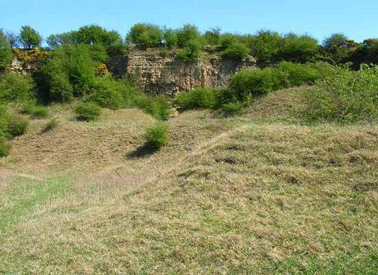 The hill slopes and former quarry support an extensive area of primary magnesian limestone grassland. Blue moor-grass, Sesleria albicans, a characteristic plant of such grassland, is present but not abundant in the primary grassland on the hill slopes, where herbs such as rock-rose, Helianthemum nummularium, are more common; blue moor-grass is more plentiful in the secondary grassland on the quarry floor and spoil heaps, where it is associated with species such as quaking grass, Briza media, salad burnet, Sanguisorba minor, and autumn gentian, Gentianella amarella.