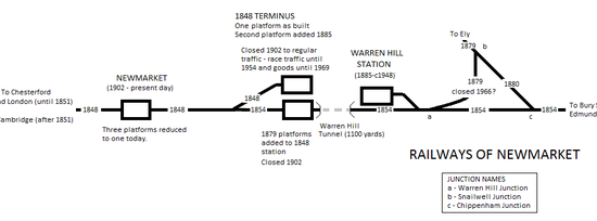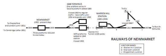 The first railway station in Newmarket opened in 1848 as the terminus of the Newmarket and Chesterford Railway. This station was extended with a new island platform and opened along with the new Newmarket to Ely line in 1879. Newmarket Warren Hill station, built by the Great Eastern Railway specifically for race traffic, opened six years later and closing just after the Second World War. The original station was replaced by a new structure in 1902 and a much reduced facility on this site remains in use today.