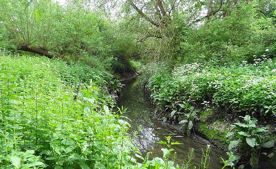 Yeading Brook is a tributary of the River Crane, in West London. It rises in major part from the Headstone Manor moat, and in minor part from a small stream flowing from Pinner Park . It follows a meandering course through North Harrow, Rayners Lane, Ruislip, South Ruislip , and onwards to Southall, before its confluence with the Crane at Hayes. It is 16 miles long and walkable along most of its length, passing through a number of parks, nature reserves and open spaces, including Yeading Brook open space , Roxbourne Park, Ruislip Gardens open space, Ickenham Marsh , Gutteridge Wood and Meadows, Ten Acre Wood, and Yeading Brook Meadows, where it joins the Grand Union canal walk and shortly thereafter becomes the river Crane.