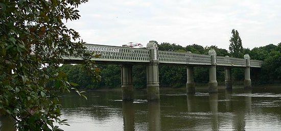 Kew Railway Bridge spans the River Thames in London, England, between Kew and Strand-on-the-Green, Chiswick. The bridge, which was given Grade II listed structure protection in 1983, was designed by W. R. Galbraith and built by Brassey & Ogilvie for the London and South Western Railway. The bridge is part of an extension to the latter company's railway line from Acton Junction to Richmond. The bridge was opened in 1869 and consists of five wrought iron lattice girder spans of 35 metres each. The cast iron piers are decorated in three stages. During the second world war a pillbox was built to guard it on the south end, along with an open enclosure to fire an anti-tank gun from.