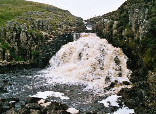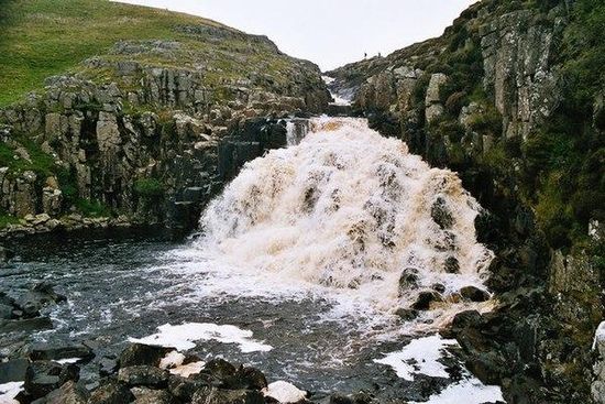 Cauldron Snout is a cascade on the upper reaches of the River Tees in Northern England, immediately below the dam of the Cow Green Reservoir. It is well upstream of the High Force waterfall, and is on the boundary between County Durham and Cumbria , England. The waterfall lies within the North Pennines Area of Outstanding Natural Beauty and European Geopark.