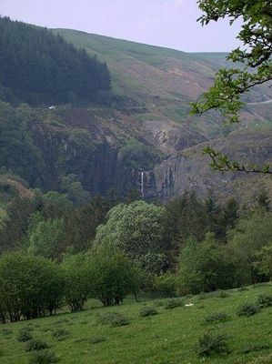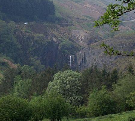 The River Twymyn flows from the 40-metre-high Ffrwd Fawr Waterfall at the head of the Pennant Valley at Dylife Gorge near Dylife.