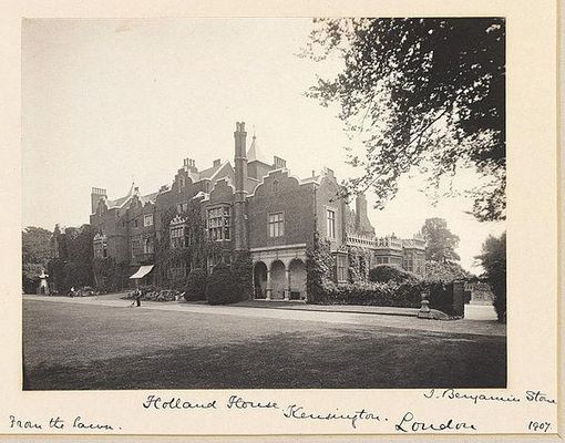 Holland House, originally known as Cope Castle, was an early Jacobean country house in Kensington, London, situated in a country estate that is now Holland Park. It was built in 1605 by the diplomat Sir Walter Cope. The building later passed by marriage to Henry Rich, 1st Baron Kensington, 1st Earl of Holland, and by descent through the Rich family, then became the property of the Fox family, during which time it became a noted gathering-place for Whigs in the 19th century. The house was largely destroyed by German firebombing during the Blitz in 1940 and today only the east wing and some ruins of the ground floor and south facade remain, along with various outbuildings and formal gardens. In 1949 the ruin was designated a grade I listed building and it is now owned by the Royal Borough of Kensington and Chelsea.
