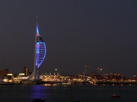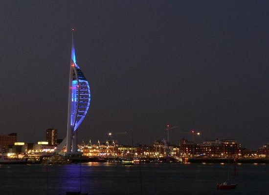 The Spinnaker Tower is a 170-metre landmark observation tower in Portsmouth, England. It is the centrepiece of the redevelopment of Portsmouth Harbour, which was supported by a National Lottery grant. The tower's design was chosen by Portsmouth residents from a selection of three different designs in a 1998 public poll. It has three viewing platforms one on top of the other at heights of 100 m, 105 m and 110 m.