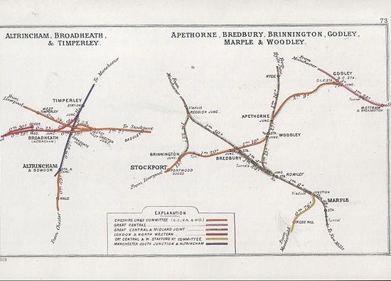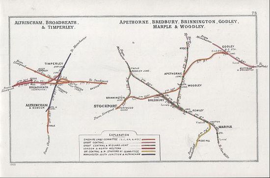 Skelton Junction is a complex of railway junctions to the south of Manchester in Timperley, near Altrincham. Both the Cheshire Lines Committee's Liverpool to Manchester line, via the Glazebrook East Junction to Skelton Junction Line and the LNWR's Warrington and Altrincham Junction Railway fed into the junction from Liverpool in the west. The Manchester, South Junction and Altrincham Railway provided a connection from the Altrincham direction and a short spur from Timperley towards Stockport, while the CLC's Stockport, Timperley and Altrincham Junction Railway continued east to Stockport.