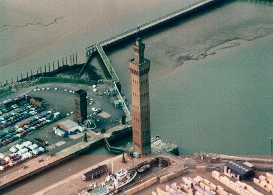 Grimsby Dock Tower is a hydraulic accumulator tower and a maritime landmark at the entrance to the Royal Dock, Grimsby, in North East Lincolnshire, England. It was completed on 27 March 1852 with the purpose of containing a 30,000-imperial-gallon reservoir at a height of 200 feet , that was used to provide hydraulic power to power the machinery of the Grimsby Docks. The extreme height of the tower was necessary to achieve sufficient pressure, and as a result of this, the tower can be seen for several miles around, even far inland on the north bank of the River Humber in villages such as Patrington.