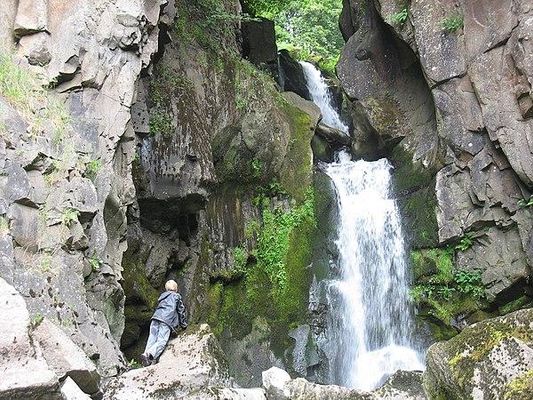 Caldron Linn is about a mile below Rumbling Bridge, and can be accessed through fields by Powmill, with a 150 ft slippery descent to reach it. The height of its fall was lessened in 1886 by rock fall.