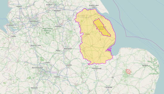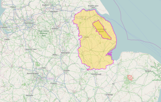 The Lincolnshire Wolds are a range of low hills in the county of Lincolnshire, England which run roughly parallel with the North Sea coast, from the Humber Estuary in the north-west to the edge of the Lincolnshire Fens in the south-east. They are a designated Area of Outstanding Natural Beauty , and the highest area of land in eastern England between Yorkshire and Kent.