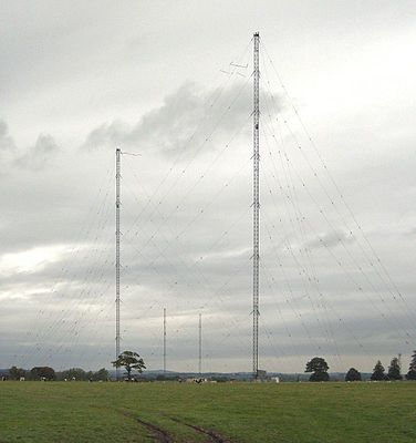 The Droitwich transmitting station is a large broadcasting facility for long-wave and medium-wave transmissions, established in 1934 in the civil parish of Dodderhill, just outside the village of Wychbold, near Droitwich in Worcestershire, England . The site is the location of the British Broadcasting Corporation's most powerful long-wave transmitter, which together with the two Scottish long-wave transmitters at Burghead and Westerglen forms a network broadcasting on the same frequency. The masts can be seen to the east from the M5 motorway, between Droitwich and Bromsgrove, as well as to the west from the Herefordshire/Worcestershire border. At night, the two sets of aircraft warning lights are visible from a long distance. Due to the bright red lights illuminated at night, some locals have renamed the site "the devil horns of Wychbold". The station is owned and operated by Arqiva.