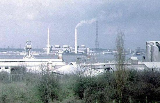 The station was built by the Central Electricity Generating Board and, unlike most of the power stations further up the Thames, West Thurrock was built on a 37 hectare green field site, 1.5 miles west of Grays. Construction, which included the piling and landfilling of the marshy riverside, took several years, starting in 1957 and continuing until 1965 - although the first generator was commissioned in 1962. It was the first CEGB station designed to exceed 1000 MW, having a final output of 1300 MW. The station had two 200 MW units and three of 300 MW units housed in a reinforced concrete turbine hall. The boilers were unusual being open to the elements and were originally designed to burn pulverised coal. They were adapted to burn natural gas between 1971 and 1980, and heavy fuel oil burning facilities were added in 1985. The station had two 175 m tall chimneys made from reinforced concrete.