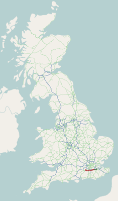 The A25 road is an east-west main road in the South-East of England. Its carries traffic east from Guildford, Surrey, eastward through Surrey and into mid-west Kent, to the town of Sevenoaks, and then on to Wrotham Heath where it connects with the A20.
