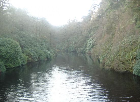 The Goyt rises on the moors of Axe Edge, near the River Dane and the Cat and Fiddle Inn. The area is known as the Upper Goyt Valley. The old Cat and Fiddle Road from Buxton to Macclesfield crosses the river just as it turns northwards to flow down its well-known valley. The river then flows under Derbyshire Bridge, which was the old boundary between Derbyshire and Cheshire. Later it reaches an old packhorse bridge that was moved when Errwood reservoir was built in the 1960s (see photo below). Further downstream there is another reservoir, the Fernilee reservoir. The original line of the Cromford and High Peak Railway can be seen near this point.