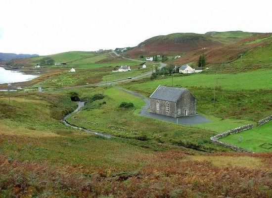 The Bracadale Free Presbyterian Church is a small Grade II listed church of the Free Presbyterian Church of Scotland in the Scottish village of Bracadale. The church is still in use, two services are held weekly. The church was built in the year 1831, replacing an older 18th-century church. The church stands on the shore of Loch Harport, a deep inlet of the Atlantic Ocean. Next to the chapel is a very old cemetery, where remains of the old St Assind's Church, a medieval church, can still be found. Two late medieval tombstones are still present here. The two first climbers of the Cuillin, Norman Collie and John Mackenzie, are also buried here.